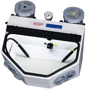Rummelig sand/glasblæse maskine. Indvendig er Kabinen udstyret med knap til finjustering af lufttryk og knap til valg af hvilken tank der skal bruges. Der er også et blæsehåndtag og en holder. Blæsehåndtagrt styres via fodkontrol. Udvendig er der mulighed for finjustering af lufttrykket. Kabinen er lavet i plast, har indvendig lys og er udstyret med specialhærdet glas. Der er mulighed for at tilkoble udsugning eller støvsuger.