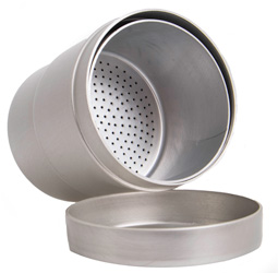 Beholderen er af aluminium og har en løs si.