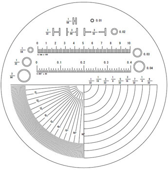 Skala nr. 3. Vinkler, radius, diameter, bredde osv. kan måles hovedsageligt i tommer