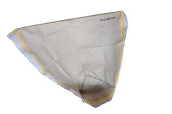 Kraftig læder fælg med en bred stofkant til at hænge fælgen op i. Der er lavet et lille hul foran i fælgen, så den kan hægtes op under bordet, når den ikke skal bruges.